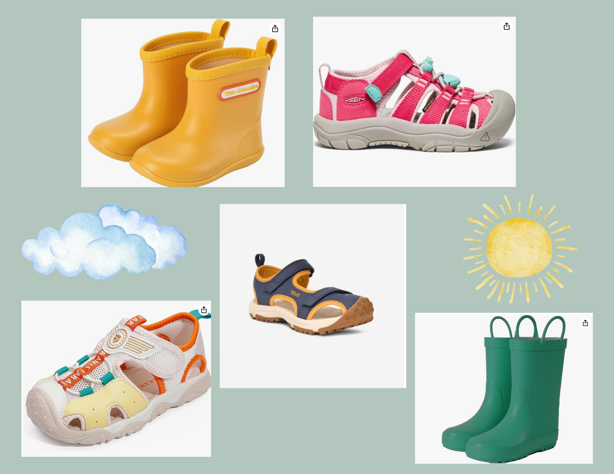 Feet: Closed-toed water shoes with sturdy soles that are also suitable for climbing and exploring. They should be breathable, quick-drying, and durable. (Keen or Teva brand is great!)